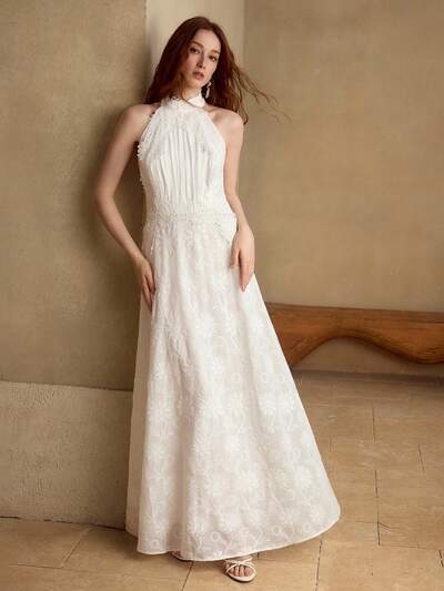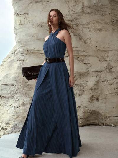 VESTIDO LARGO DE LINO CON NUDO RETORCIDO Y CUELLO HALTER PARA MUJER, PRIMAVERA/VERANO-38%