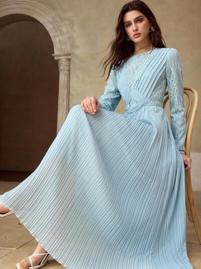 VESTIDO AZUL PLISADO CON ENCAJE DE CONTRASTE DE GASA PARA MUJER, PRIMAVERA/VERANO, SILUETA ELEGANTE Y AJUSTADA-34%