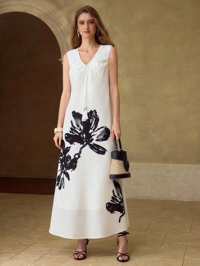 Vestido con cuello en V, estampado floral de pintura de tinta y detalles de rhinestones-23%