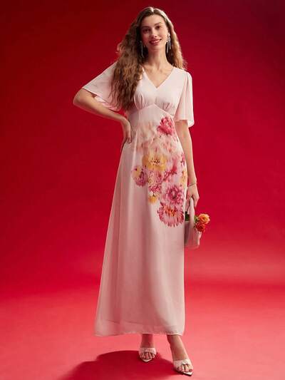 VESTIDO DE MUJER ELEGANTE CON CUELLO EN V, VOLANTES EN EL BAJO Y ESTAMPADO FLORAL-34%