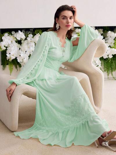 ZEYLAH Vestido elegante de manga larga con cuello redondo, con contraste de color y decorado con flores enjoyadas para mujer-50%