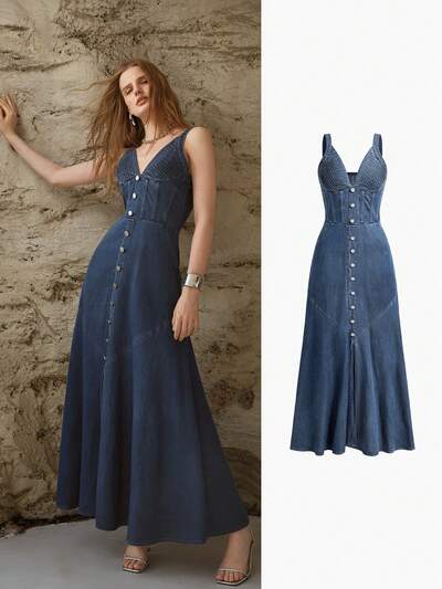 VESTIDO DESLIZANTE CON PLIEGUES EN EL BUSTO DE MEZCLILLA, PRIMAVERA/VERANO