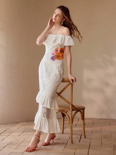 VESTIDO CON ESCOTE DESCUBIERTO DE HOMBROS Y ENCAJE DE CONTRASTE