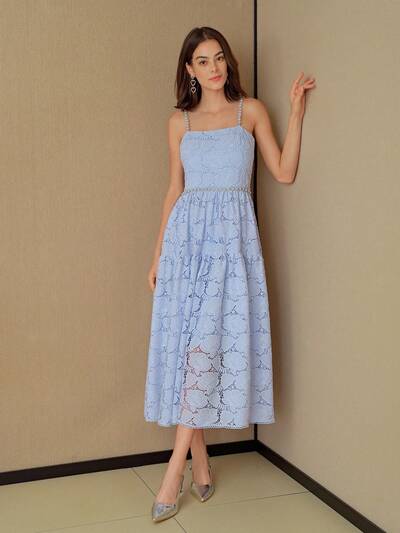 MOTF STUDIO Vestido de tirantes con superposición de encaje de guipur y detalle de perlas falsas-34%