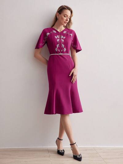 VESTIDO SÓLIDO CON DETALLE DE FLORES ESTEREO Y ABERTURA EN LOS MUSLOS-34%