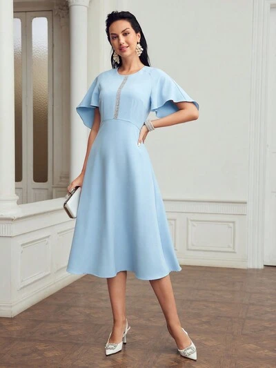 VESTIDO CON DETALLES DE PEDRERÍA, MANGA ACAMPANADA CON FALDA ACAMPANADA-42%