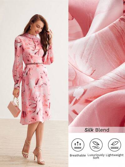 Vestido Con Mangas De Linterna Con Cuello De Ojo De Cerradura Y Estampado De Plantas De Seda-34%