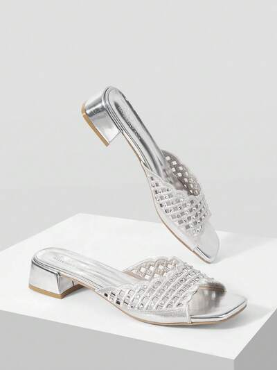 Sandalias de tacón medio con punta cuadrada hueca con rhinestones, estilo vintage francés para mujeres. Calzado casual, versátil, transpirable, antideslizante, cómodo y duradero para la playa.-14%