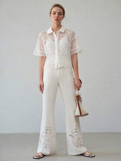 Pantalones de vestir con vuelo bordados con flores de lino-40%