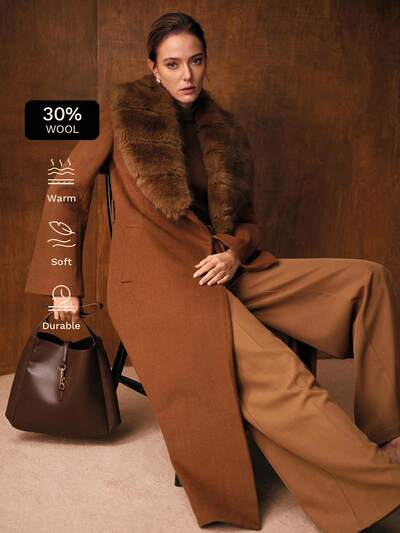 Abrigo de lana digno con cuello de piel, mangas acampanadas y cintura con lazo para otoño/invierno-59%