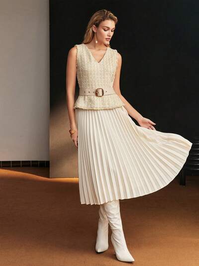 Robe avec corsage en tweed, ourlet plissé et ceinture-23%