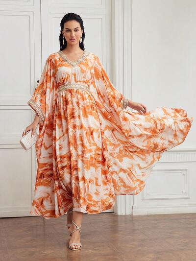 ROBE À OURLET DE SIRÈNE À MANCHES CLOCHES AVEC DÉTAIL DE PERLES FAUSSES ET PERLES-23%