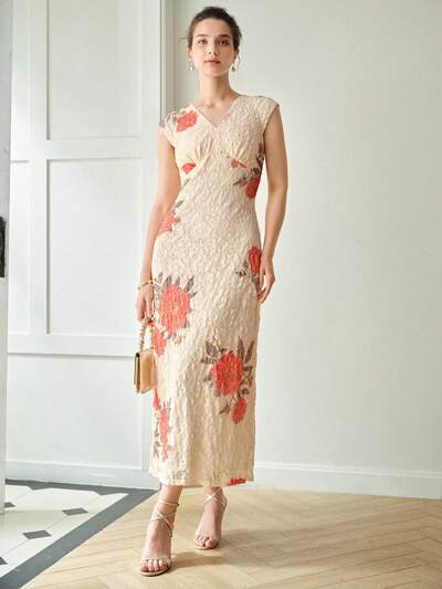 ROBE À OURLET DE QUEUE DE SIRÈNE MESH À BRODERIE FLORALE AVEC DÉCOLLETÉ EN CHEVRON-23%