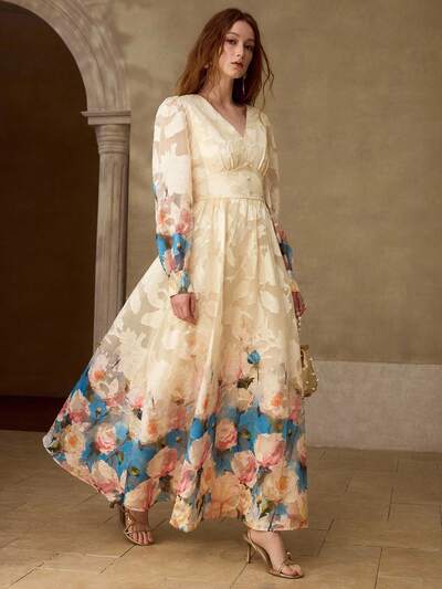 ROBE LONGUE POUR FEMMES À COL EN V, TAILLE CINTRÉE, IMPRIMÉ NUMÉRIQUE OMBRÉ FLORAL, ÉTÉ-58%