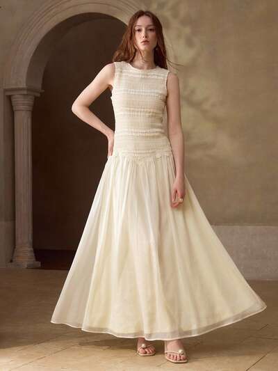 NOUVELLE ROBE LONGUE POUR FEMMES EN CHIFFON BRILLANT À COL ROND SANS MANCHES, AVEC PATCHWORK TRICOTÉ ET BRODÉ, COLLECTION PRINTEMPS/ÉTÉ-23%
