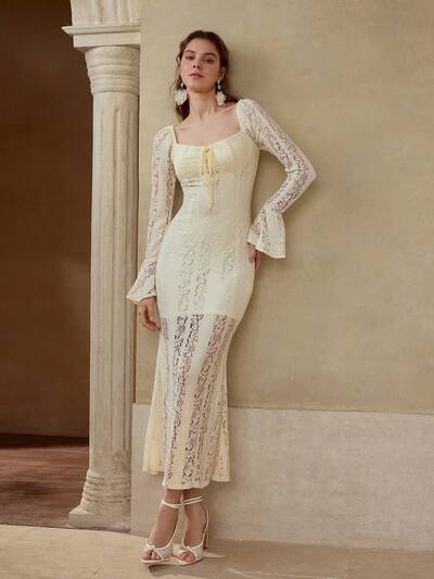 ROBE LONGUE ÉLÉGANTE ET ROMANTIQUE POUR FEMMES, COL V EN DENTELLE, COUPE ÉVASÉE EN SATIN BRILLANT