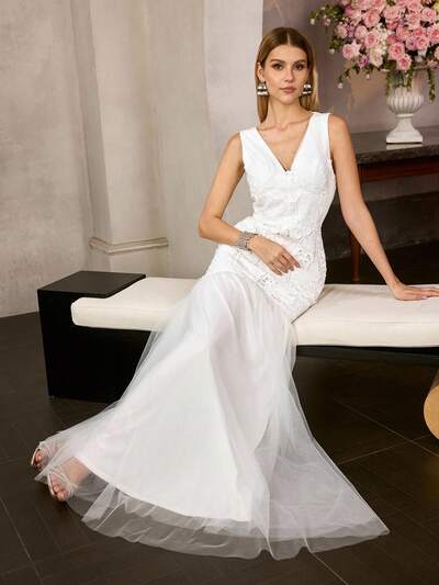 MOTF Soiréza ROBE DE SOIRÉE ÉLÉGANTE SANS MANCHES À COL V LONGUEUR PLANCHER POUR FEMMES ET ROBE DE MARIÉE LÉGÈRE - DENTELLE FLORALE ET SUPERPOSITION DE TULLE TRANSPARENT, SILHOUETTE MOULANTE POUR MARIAGES, GALAS