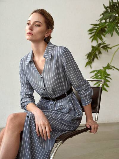 Robe mi-longue en lin à manches longues et col en V rayé pour femmes-25%