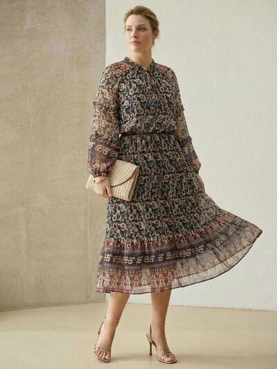 Robe romantique à manches longues avec volants à l'ourlet, imprimé bohème-42%