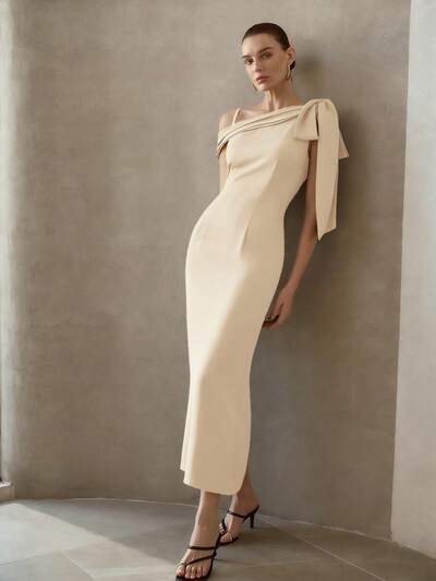 ROBE LONGUE AJUSTÉE ASYMÉTRIQUE À ÉPAULE AVEC NŒUD ÉLÉGANT