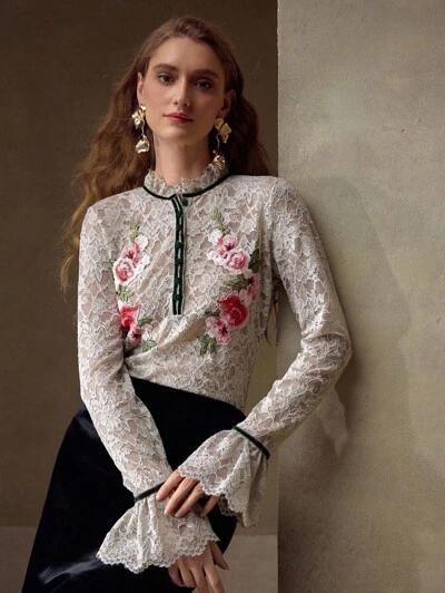 Camicetta semi-trasparente elegante con maniche a sbuffo, applicazioni floreali ricamate, piping a contrasto e bordi in pizzo-42%