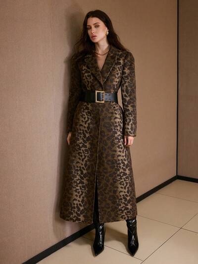 Cappotto lungo con vita stretta a stampa leopardata, autunno/inverno-25%