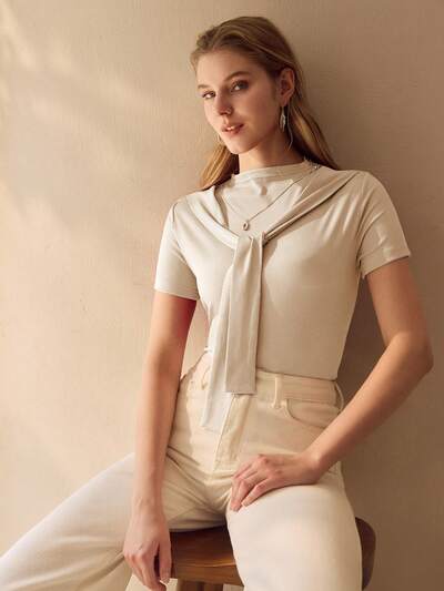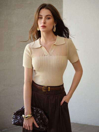 Maglietta aderente a maniche corte con colletto a nodo, colore unito, casual, estiva, da donna-25%