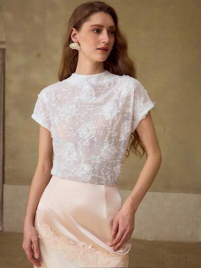Elegante e raffinata maglietta da donna con colletto alla coreana e maniche corte, con ricamo di rose-44%