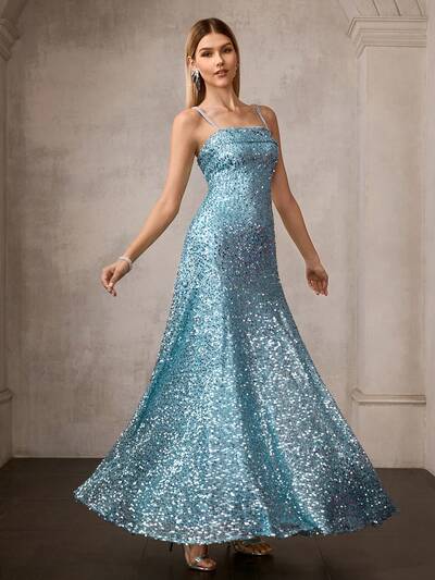 エレガントで豪華な ライトブルー ノースリーブ アンクル丈 スパークリングシーケンスパーティードレス - ラインストーン装飾のスパゲッティストラップ、冬のパーティー、ガラ、年末年始、フォーマルイベントに最適-47%