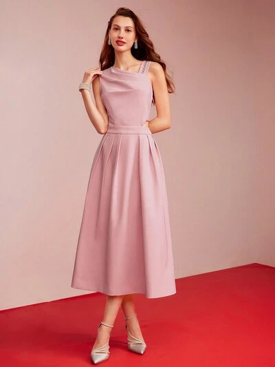 編み込み 女性用 非対称ネック チェーン ディテール フォールド プリーツ ドレス、バレンタインデーの服装-61%