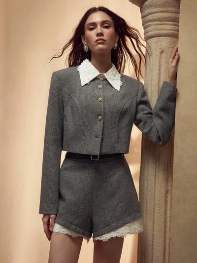 エレガントなツイードジャケット ゴールドボタンデコレーション、レーストリム、仕事用、レディース-26%