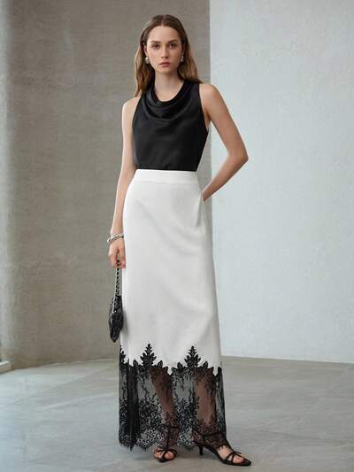 女性用サテン&レースパッチワークコントラストカラースカート-63%