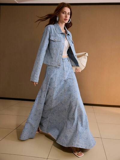 デニム オールオーバー フローラル プリント フレアマキシスカート、春夏秋-60%
