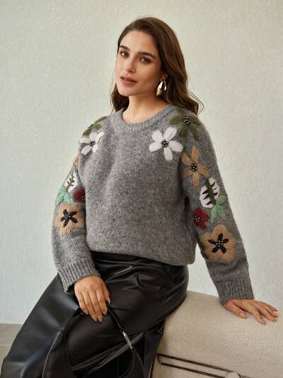 ヴィンテージ フローラル刺繍 ルーズフィット プラスサイズ ニットトップ-37%