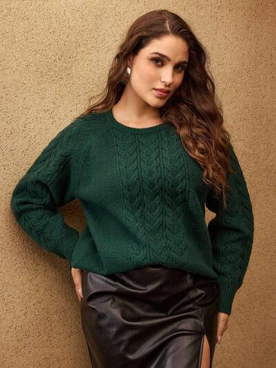 プラスサイズ ケーブルニットセーター メタルボタン付き、多用途 ミリタリーグリーン-48%