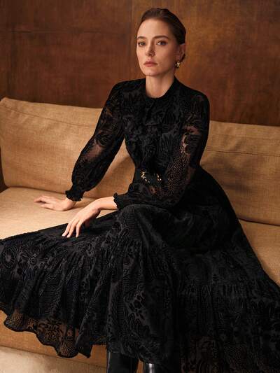 秋冬ファッション ウエストシェイピング スリミング Aラインレースパッチワーク 透かし彫りデザイン ロングドレス レディース-56%