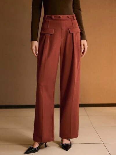女性用ストレートレッグカジュアルパンツ、スリムシルエット、秋冬、ブラウン-レッド色-36%