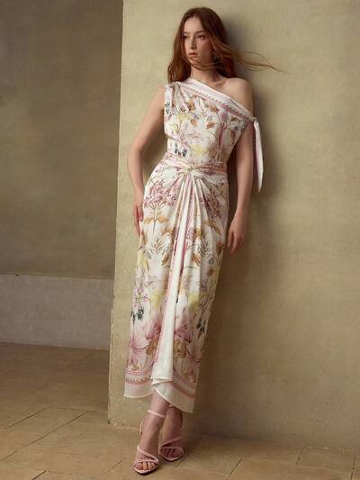 女性用 春夏 フローラル ロマンチック アシンメトリーネック ミドル丈ドレス-8%