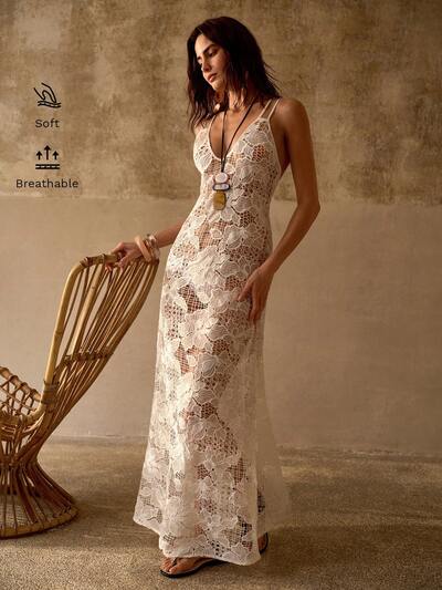 エレガントでロマンチックなVネック ノースリーブ ハンドメイド クロシェ ウェーブ テクスチャー レディース ビーチ バケーション ボヘミアン マキシ シアー ニットドレス カバーアップ-63%