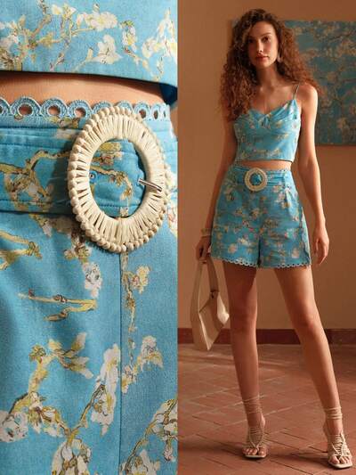 플로럴 프린트 레이스 트림 버클 벨트 반바지-33%