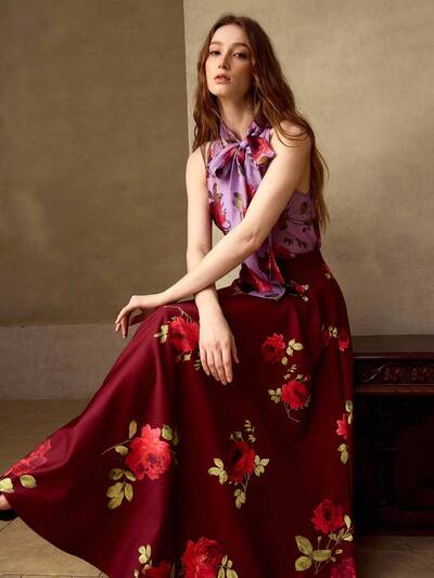 여성용 로즈 프린트 우아한 미디 길이 A라인 스커트, 데이트, 봄/여름에 적합-32%