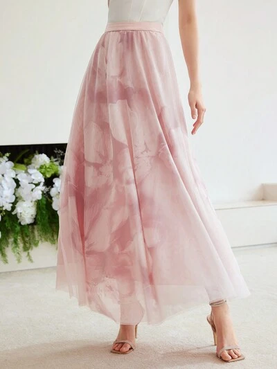 메쉬 폴카 도트와 식물 프린트 레이어드 럭플 비대칭 밑단 스커트-25%