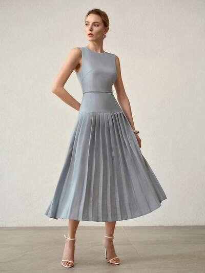 우아한 허리 졸라매는 핏 롱 플리츠 드레스, 봄/여름-25%