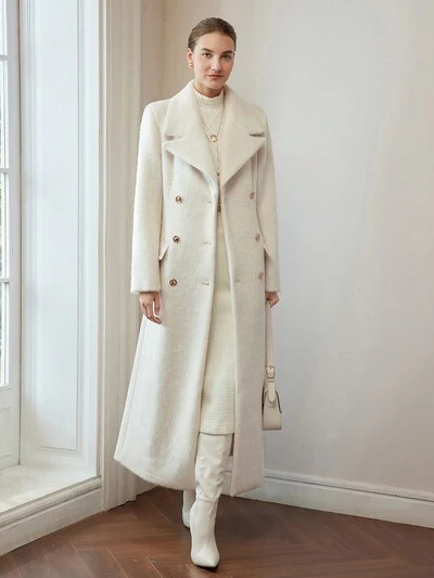 여성용 숄 칼라 메탈 허리 벨트 헤링본 텍스처 롱 오버코트-26%