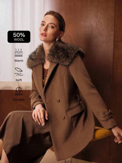 솔리드 라펠 칼라 슬랜트 포켓 더블 버튼 플래킷 인조 퍼 코트, 가을 겨울-40%