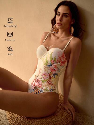 DELICATE ROMANTIC FLORAL PATTERN LASER ENGRAVED PATCHWORK FABRIC METAL DECOR WOMEN BEACH VACATION ONE-PIECE SWIMSUIT