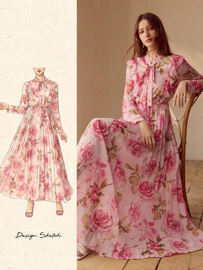 WOMEN'S ALLOVER ROSE FLORAL PRINT PLEATED DRESS-50%