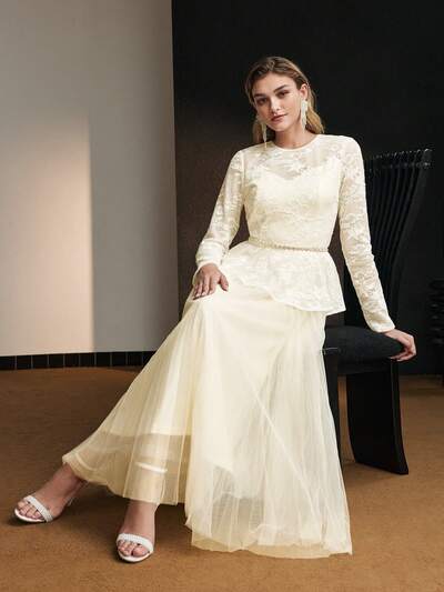 MESH APPLIQUES OVERLAY BUCKLE BELTED FORMAL EVENING DRESS GOWN-8%