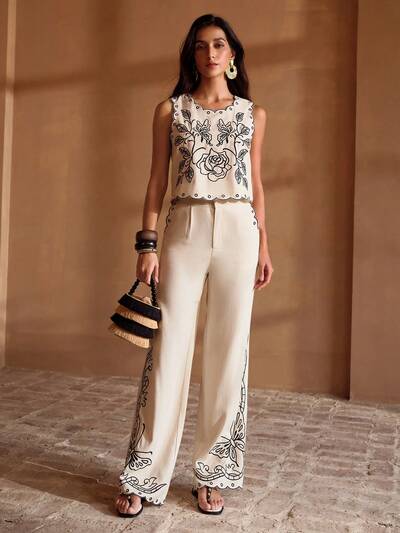 LINEN FLORAL EMBROIDERY SUIT PANTS