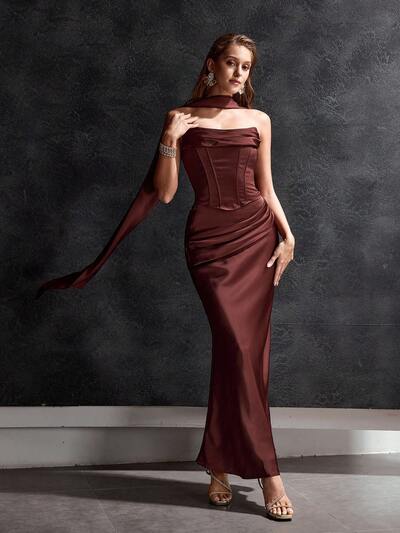 MOTF Soiréza Elegancka, dopasowana, długa satynowa suknia imprezowa na jedno ramię z marszczeniami na piersi, wiązaniem na plecach i asymetrycznym wykończeniem z tiulu, idealna na śluby, gale i sylwestra-58%